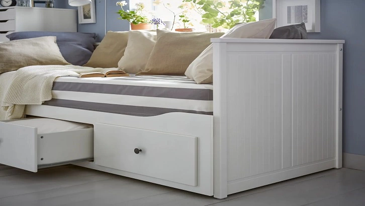 La función de un sofá, una cama y un cajón de almacenamiento, todo se convierte en uno en este rincón blanco.